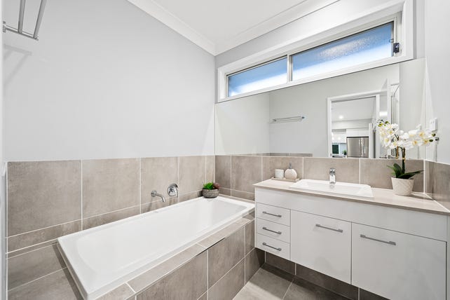 High feature and raked ceilings enhance space and light. Includes a study nook, ducted air-conditioning, ceiling fans, tiled floors, carpeted bedrooms, spacious linen cupboard, built-in laundry cabinetry, low-maintenance backyard, and landscaped front yard.